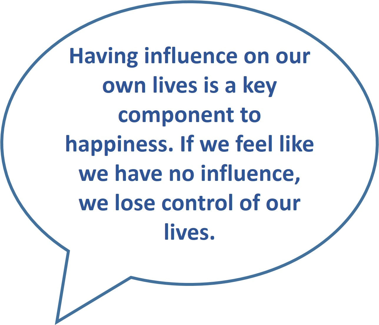 Having influence on our own lives is a key component to happiness. If we feel like we have no influence, we lose control of our lives. This is why it is important to find out in what areas of our lives we lack influence and then take action to ensure that we regain our influence and control.